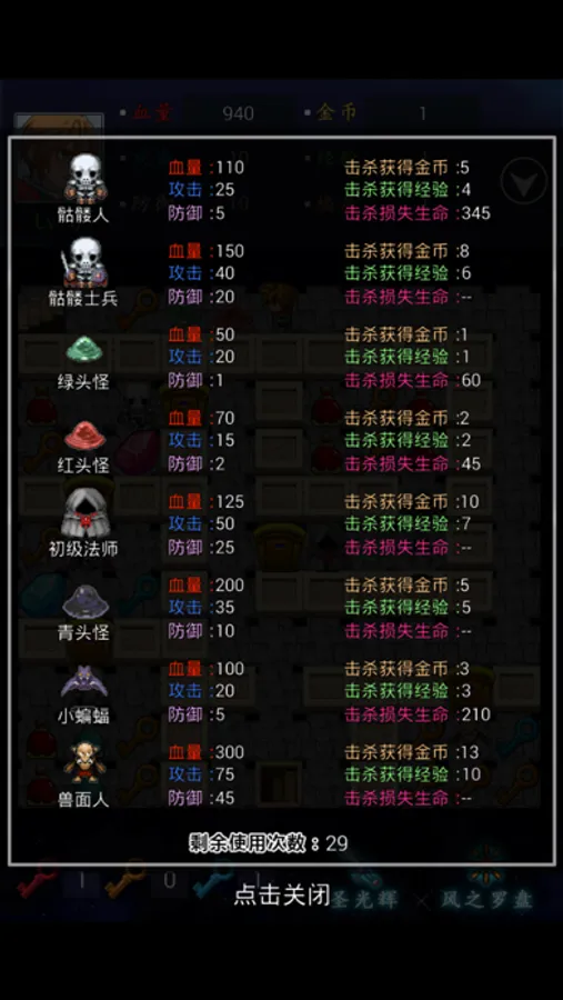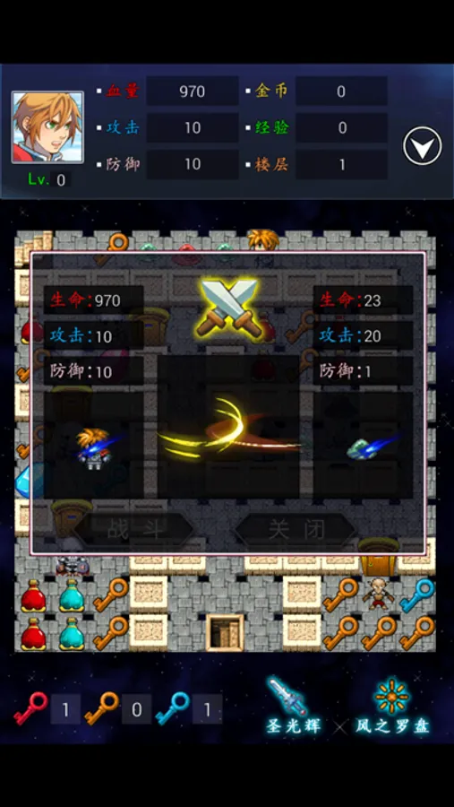 勇士在地下城的探险中需要清理每一层的小怪,杀死小怪可以获得金币,用金币购买道具和攻防属性可以迅速提高你的战斗和防御力。