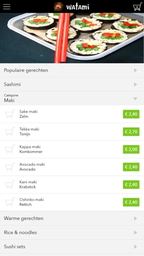 De Sushi Watami app is gemaakt om gemakkelijker en sneller een bestelling te kunnen plaatsen door middel van een simpele menukaart. In de menukaart kunt u onder andere kiezen voor populaire gerechten, maar u kunt zelf ook een menu opstellen.
