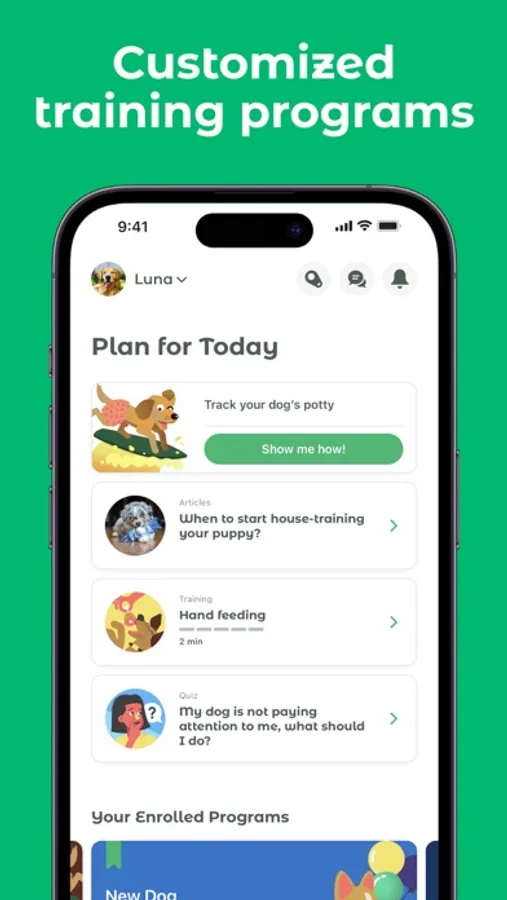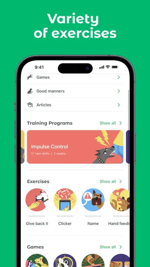 We have 9 programs to choose from (New Dog Puppy Program, Basic Obedience, Impulse Control, Little Helper, Pleasant Walks, Potty Training, Puppy Bites, Stay Active, and Strengthening Your Friendship). Get 100+ exclusive guided videos for all essential skills and behaviors (reliable recall, leash training, sitting, come, down, stay, puppy potty training, welcoming a new adopt pet, puppy games, house training, fetch the leash, stopping puppy biting, not jumping on people, separation anxiety, dog bark control and stop, dog voice and noise control, tail wag, calm around other dogs, staying on a place, loose-leash walking, impulse control, high-five, give a paw, rollover, peekaboo, spin, weave, jump over, crawl and much more), learn tricks, play games and enjoy the dog life with your pooch.