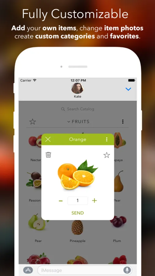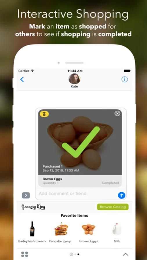• Very simple to use, just tap on an item that you want to shop, pick the quantity and send the message. On the recipient end the item to be purchased is clearly displayed with big beautiful imagery which ensures that the correct item is purchased from the store the first time around and hence saving time. To mark an item as shopped, just tap on the item in the message window and select the quantity you have purchased and press the send button and voila the item is marked as completed for everyone to see.