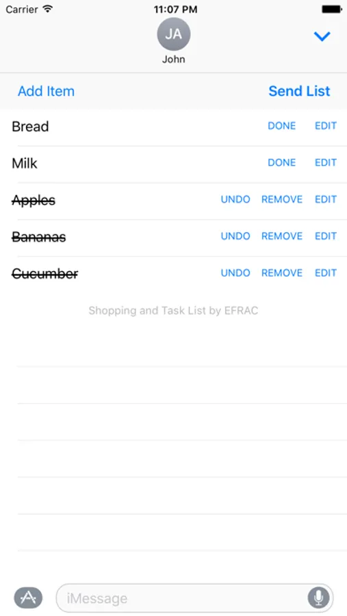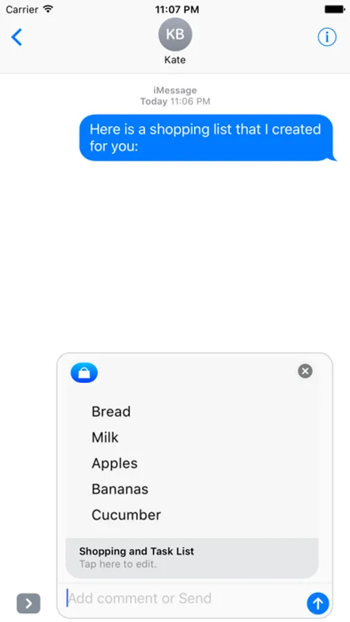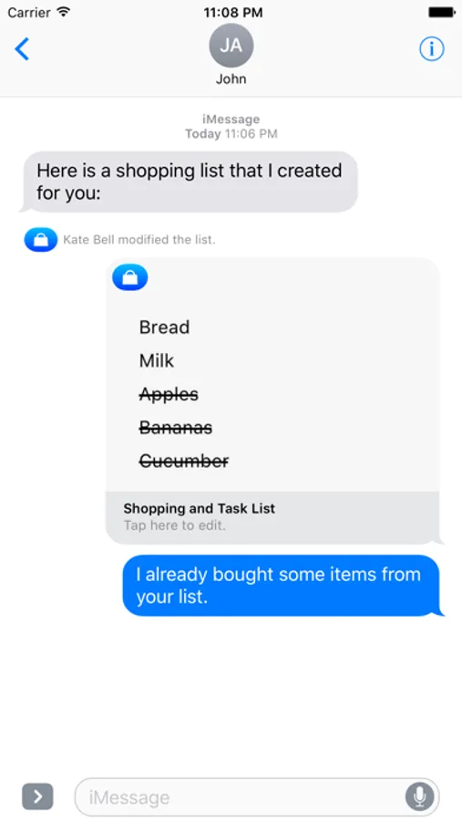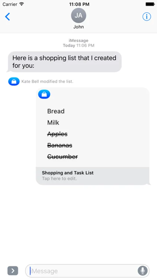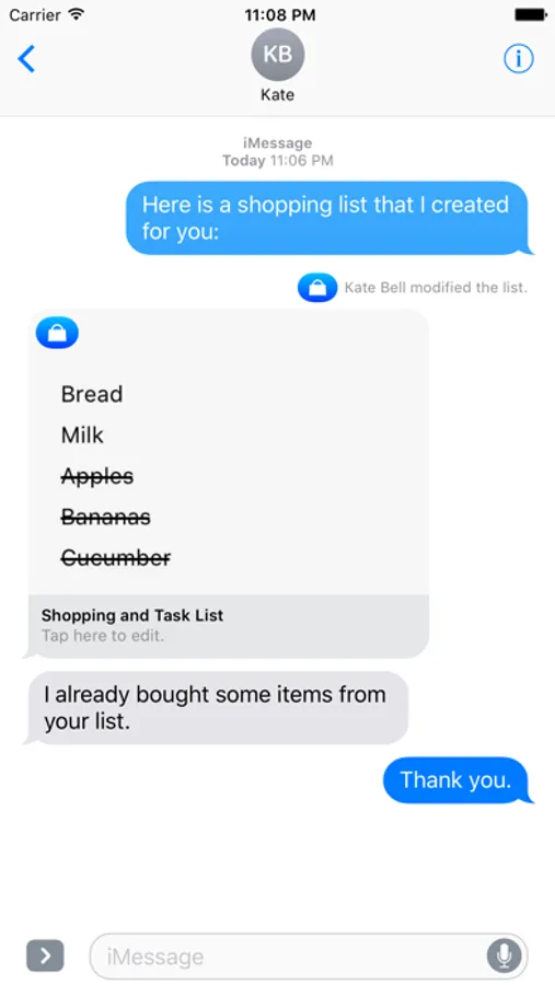Shopping and Task List is an iMessage app that allows you to create a shopping list or a task list. You and all recipients of your messages can then mark any item as done, remove it or add new items to the list.