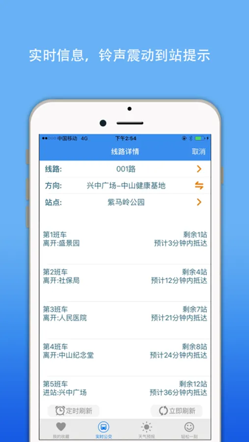 现已添加站点收藏,立即刷新,手动刷新,到站提醒,天气预报轻松一刻等功能。后续会添加更多设置菜单,后台到站查询,到站推送提醒,KFC麦当劳优惠券等功能敬请期待。
