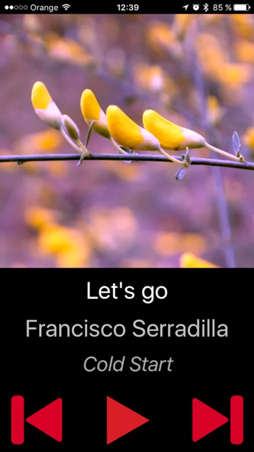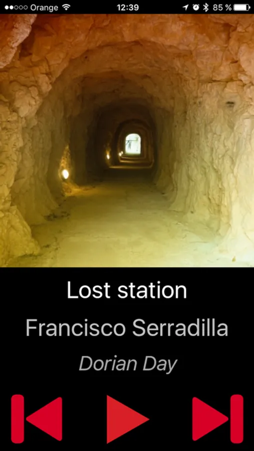 When playing a song, a very simplified interface is shown: artwork, song title and album, in very big typeface. And for the control: stop / play, previous track and next track big buttons. To return to the playlist selection, touch over the artwork.