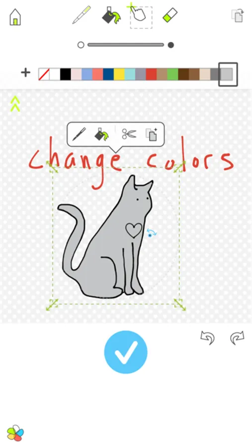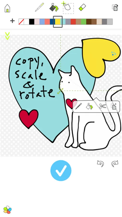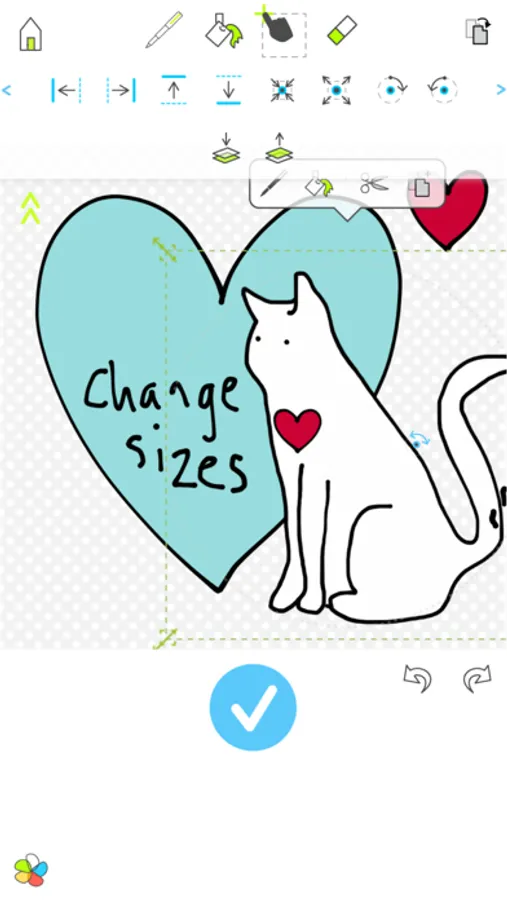 The main app is where you have the choice to make an animated sticker. With the vector-like drawing, it is so easy to create an animation. No complicated tools or commands. Just advance the screen and your doodle advances too. Add, delete, stretch, scale, move the doodles intuitively. Make your animation 2 to 8 frames long. Save it as a small, medium or large sticker.