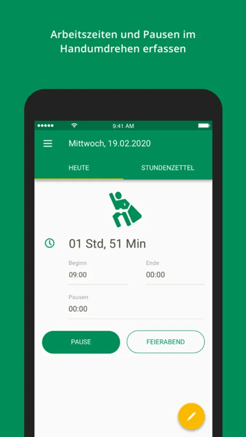- Arbeitszeiten und Pausen ganz leicht erfassen. Start, Feierabend, Fertig