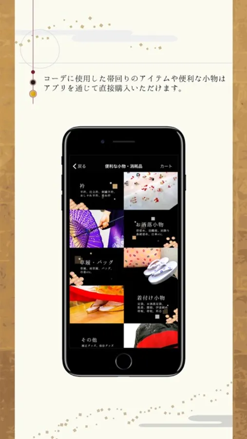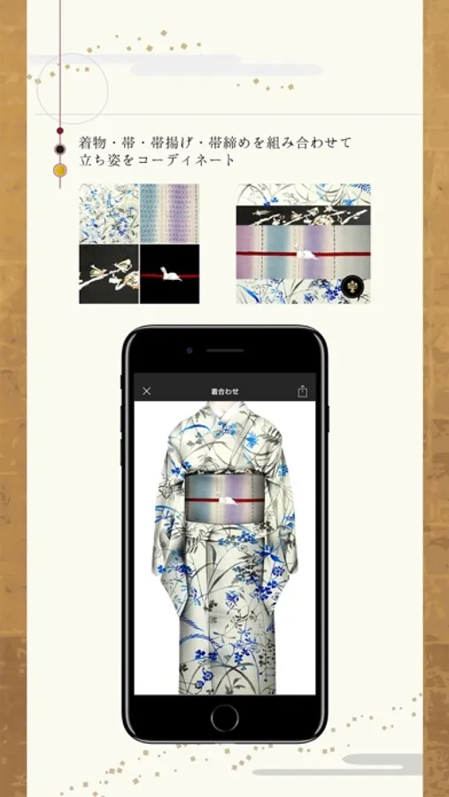 手持ちの着物や帯を撮影し、コーディネートの変化を楽しめます。