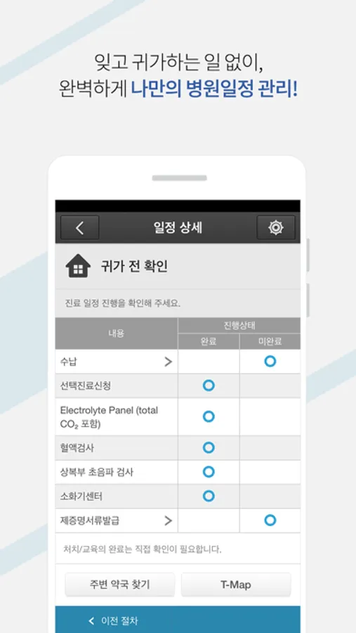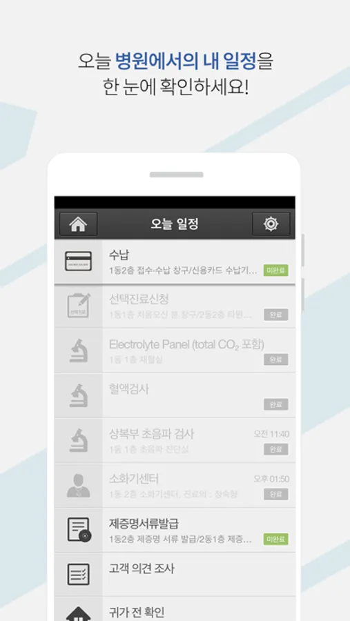 스마트폰 앱으로 이용 할 수 있는 이 서비스는 전체 예약현황, 그날의 진료 및 검사 일정과 상세내용, 진료비 수납안내, 설문조사, 일정 완료여부 등 모든 단계 마다 해야 할 일에 대한 정보를 실시간 으로 알려드립니다.