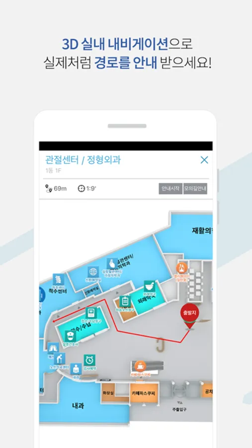 또한 진료실이나 검사실, 식당 등 병원 안네서 가야 할 곳의 위치를 자동으로 찾아주고 3D내비게이션으로 경로 안내를 해드릴 수 있어 보다 편리하게 병원을 이용 할 수 있습니다.