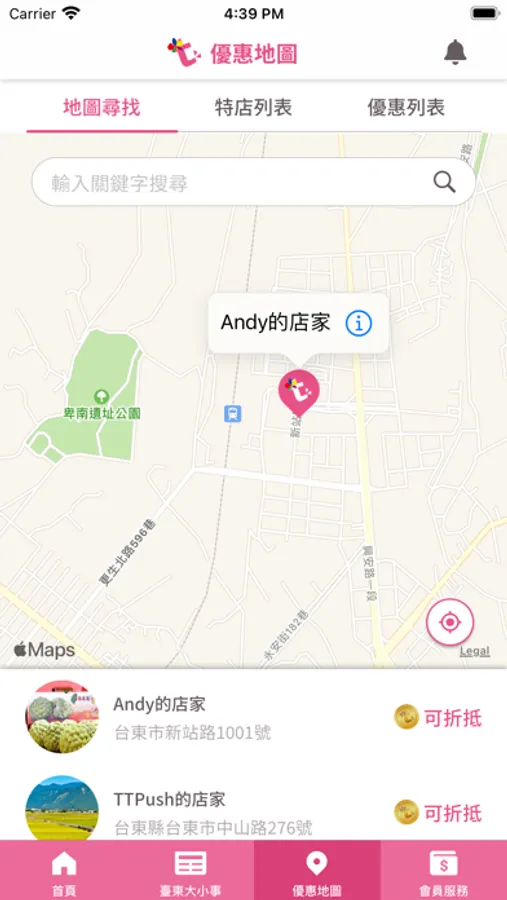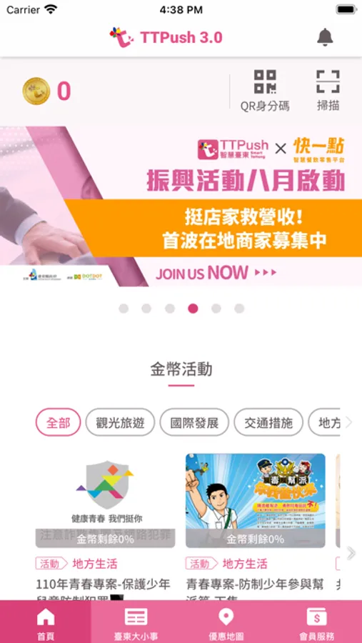 「TTPush 踢一下」也提供了虛擬貨幣(臺東金幣)服務,網羅了臺東(台東)縣境內知名優質店家商品,透過TTPush收集到的臺東(台東)金幣,可以到遍佈全臺東(台東)的特約店家進行購物折扣或兌換商品,其中不乏臺東(台東)知名的老字號超人氣名店、老饕強力推薦的地方小吃、燈光好氣氛佳的咖啡下午茶、送禮自用皆相宜的臺東(台東)必備伴手禮。「TTPush踢一下」不僅是臺東(台東)縣民,也歡迎有計畫旅行台東、台東自遊行或進行台東自由行旅遊的朋友們踴躍下載使用。