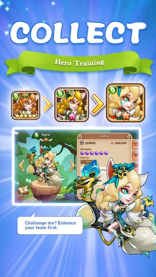 More than 400 Heroes in different factions with specific skills. Summon your Warriors, TRAIN them to become powerful heroes, or convert them into Spirit material for EVOLVING. Forge magical gears, and outfit your warriors for victory!