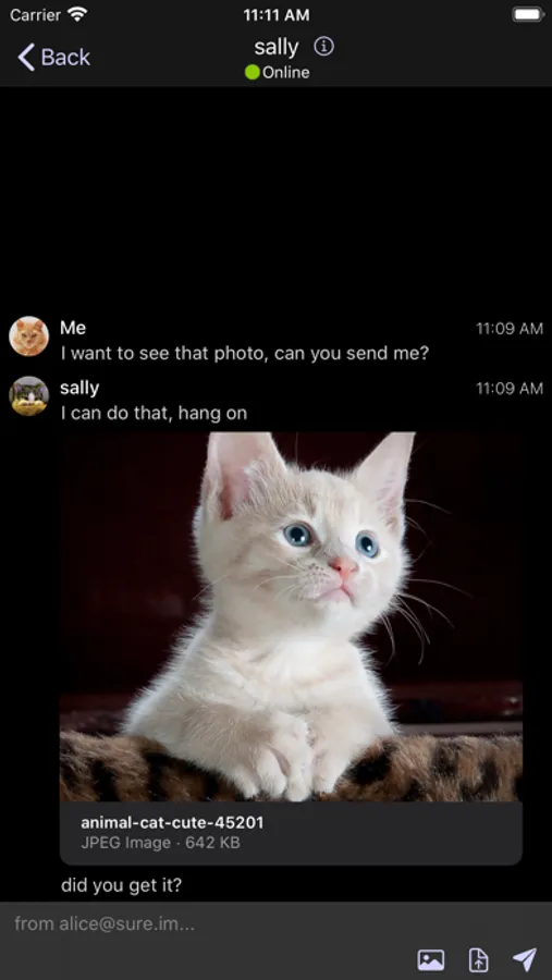 - Photos and other files easy sharing in private chats and in group chats, even with people using different XMPP clients.