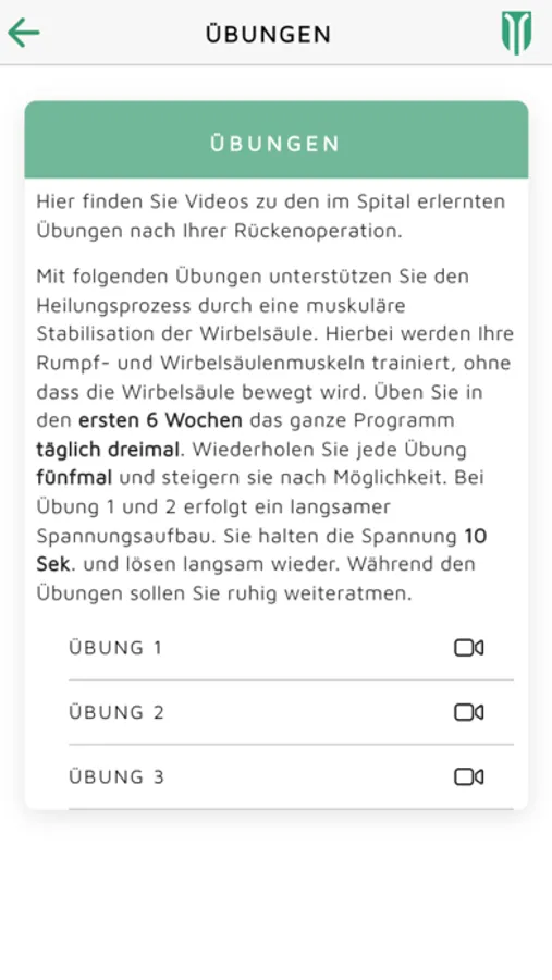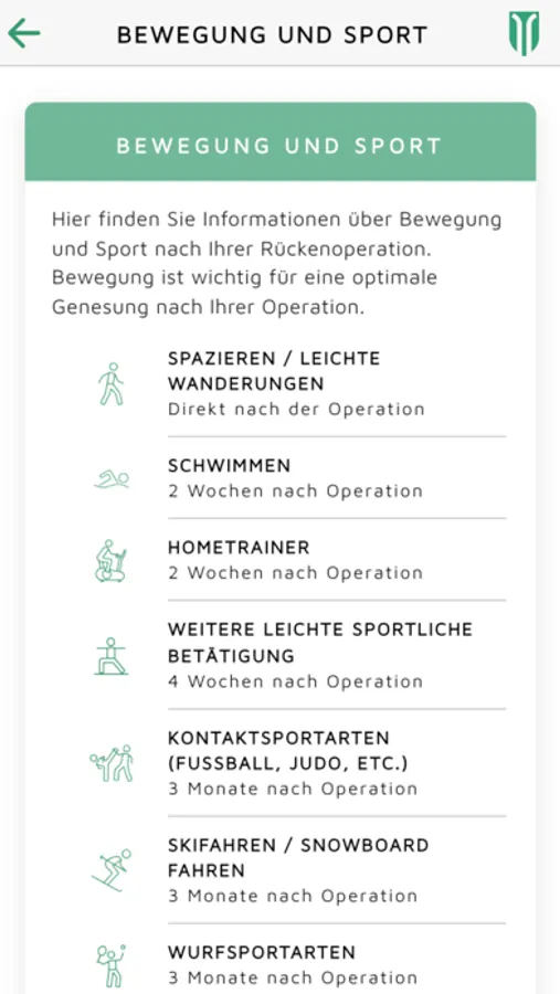 Um den Wiedereinstieg in den Alltag zu vereinfachen bekommen Sie in der App Informationen zum Krankheitsbild, Spitalaufenthalt, Übungen, Alltagsaktivitäten und Bewegung und Sport.