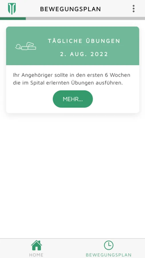 Als Patient oder Angehörige eines Patienten wird Ihnen ein Bewegungsplan zur Verfügung gestellt. Anhand dieses Bewegungsplans bekommen Sie laufend Information zu Ihren Übungen, Alltagsaktivitäten und Sport.
