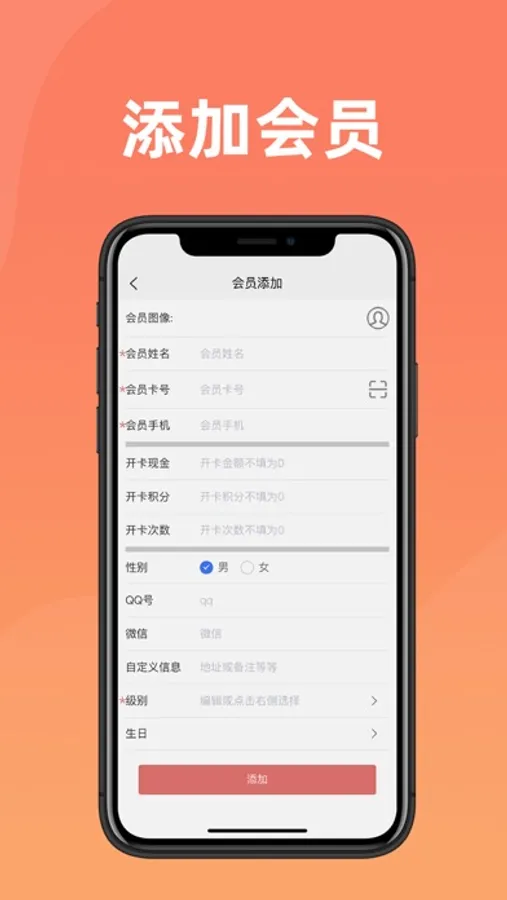 会员添加功能:管理自己店铺会员信息,记录会员会员卡信息余额等资料。