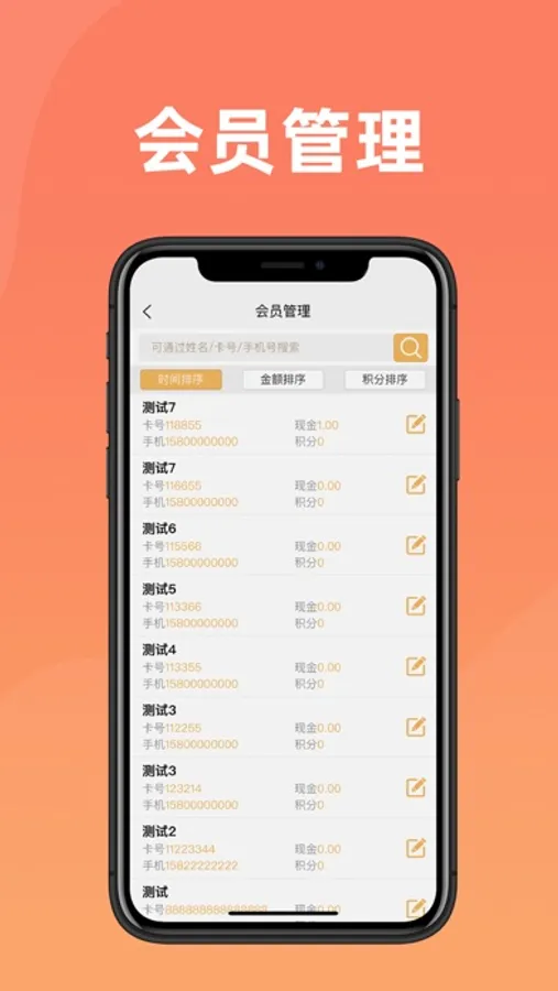 会员管理功能:本系统不限制添加会员数量,做到永久免费,无会员数量限制,可通过会员姓名、会员手机号、会员卡号信息搜索会员。