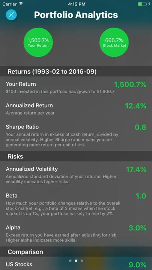 - See portfolio returns, volatility, Sharpe ratio, alpha, and beta at a glance.
