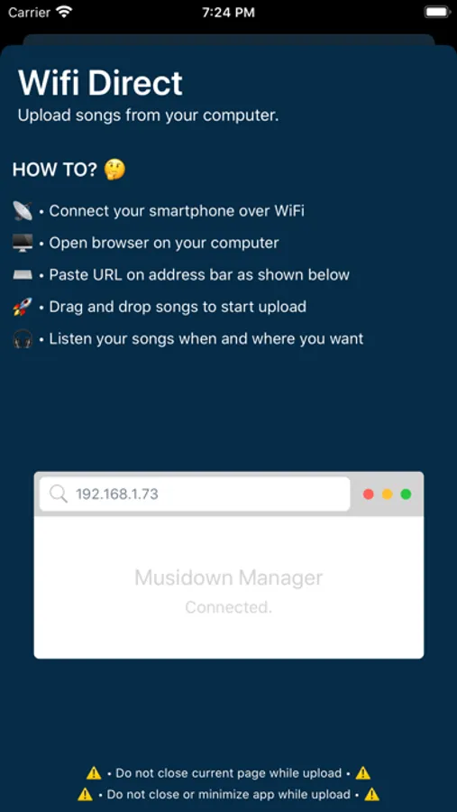 WiFi Direct: Connect your iPhone over home WiFi and download all the songs you have on your computer without connecting the iPhone via USB cable.