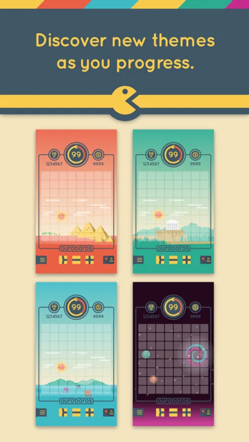 Ouroboros is also the name of the mythical snake, symbol of eternal renewal. This ancient creature inspired our fun, addictive puzzle game that will constantly challenge you to think differently and create anew from destruction.
