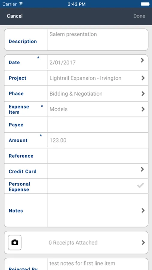 - Identify the date, payee, reference ID and credit card associated with the expense item
