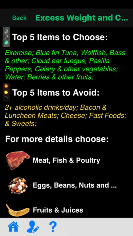 • ACTIONABLE information on what is good, what is bad, and what is neutral for your condition(s). We single out specific food items, and give you an ordered list of helpful and harmful foods within each food group.