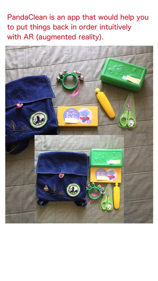 PandaCleanAR is an app that helps you to tidy up smoothly with the AR (augmented reality) function. You can compare the "actual things" and "organized things taken in a picture" through the camera, and by doing this, you can tidy up easily and quickly.