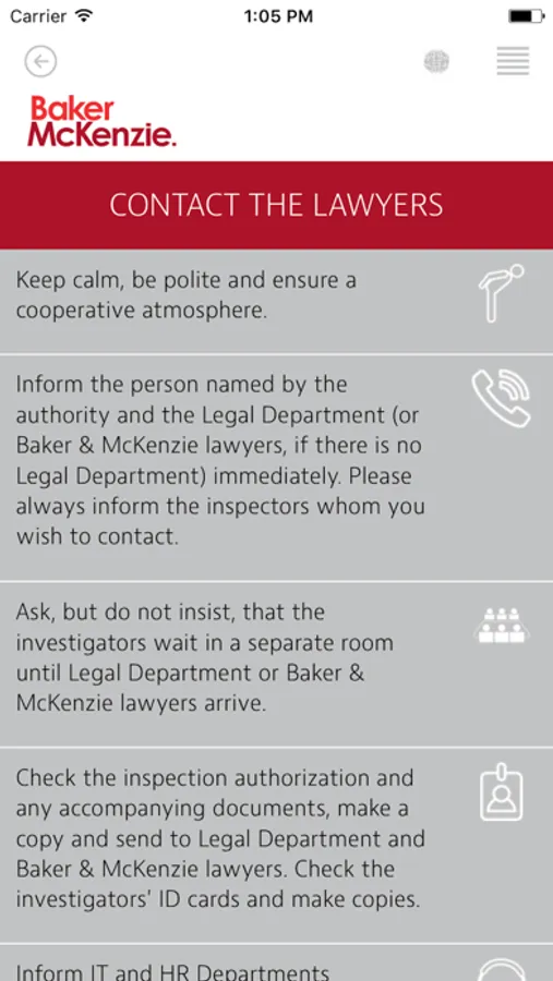 • Camera accessibility so users can take and send photos of the dawn raid warrant and other key documents so Baker McKenzie can provide immediate legal support