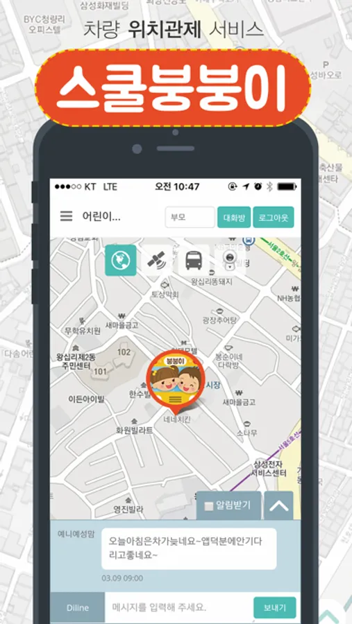 통학버스 위치 알리미 “스쿨붕붕이”는 날씨, 교통 상황에 따라 변하는 통학버스의 이동 동선을 실시간으로 확인하여 버스 도착 시간에 맞춰 아이들을 준비시킬 수 있고 기다리는 시간을 줄일 수 있는 통학버스 실시간 위치 서비스입니다.