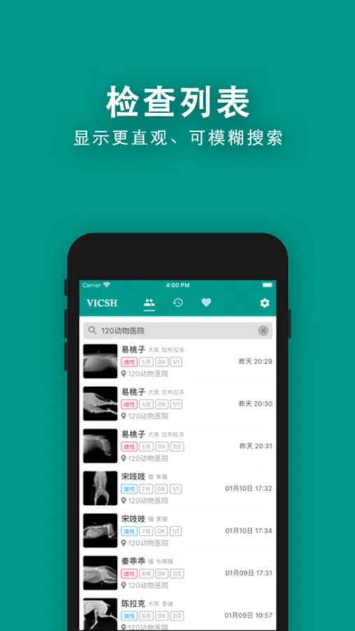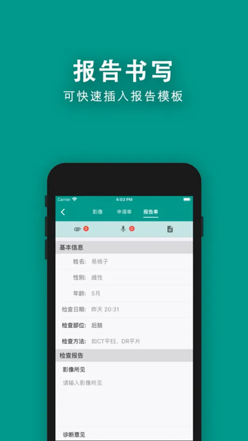 5、检查报告单功能,可书写宠物摆位报告,提供了完整流程:书写》审核》取消审核,也可以为检查建多份报告单,检查报告中也可以上传照片,录制语音。