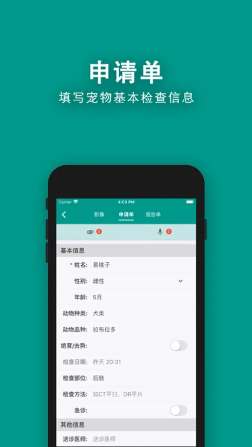 4、检查申请单功能,除可填写动物检查基本信息外,还可以拍照纸质申请单上传或录制一段语音;