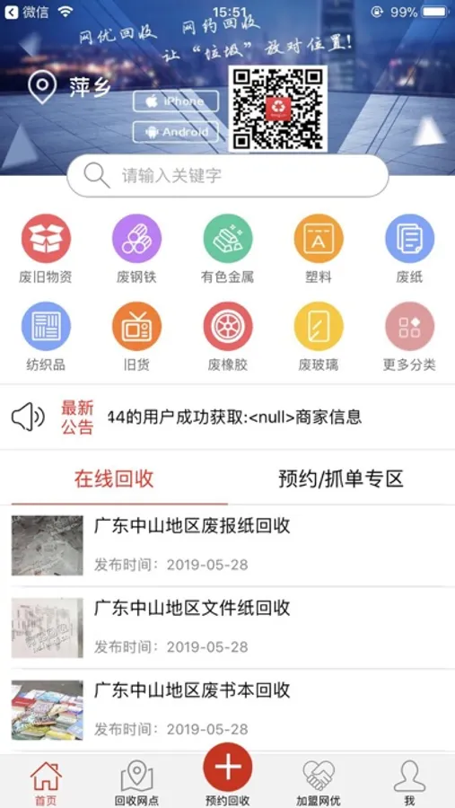 网优回收APP为回收企业、加工拆解企业、利废企业、产废企业、政府、事业单位、家庭、个人提供互联网+回收的循环利用在线交易平台;让产废方足不出户便可在线处理生活类弃物及工业类废弃物;为收废企业提供一款移动互联网回收废品的在线交易软件。助推我国再生资源企业转型升级,颠覆传统回收模式,利用网优回收软件,实现企业上门回收废旧物资、废料、二手设备等废品,缩短了交易周期,精准回收,去中间商化,提高回收效率,无缝对接产废方和利废方。