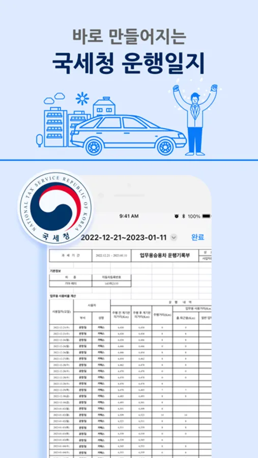 - 국세청에서 고시한 업무용승용차 운행기록부 양식으로 운행일지 생성 (법인차량 운행일지)