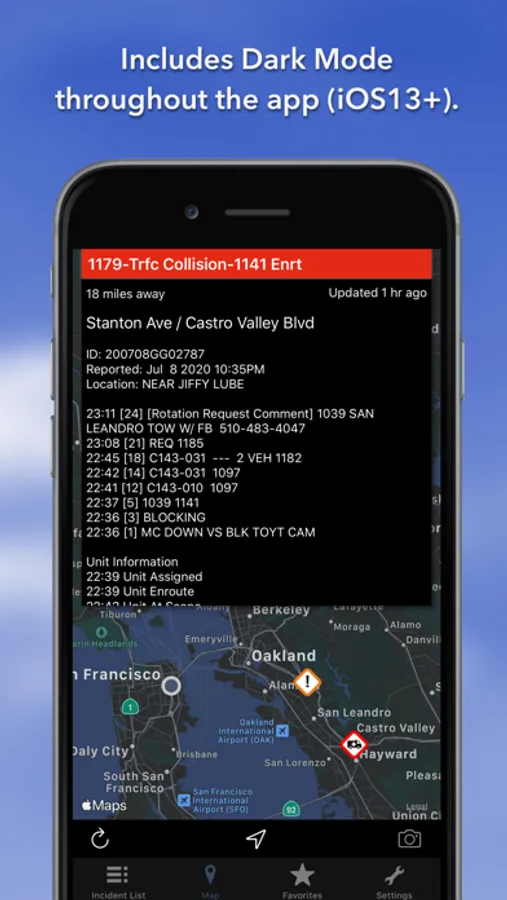 - Shows current incidents in order of distance from your current location (closest incidents are shown first).