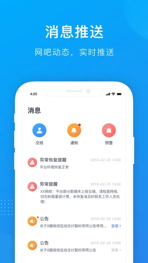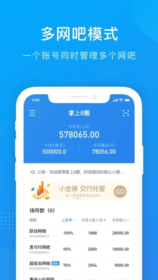 掌上8圈是专门为网吧老板/店长提供实时查询网吧经营状况的网吧助手APP,通过友好的交互界面,简洁的视觉体现,使其更加简单、易操作,让网吧老板/店长仅通过手机就能了解整个网吧的经营状况。