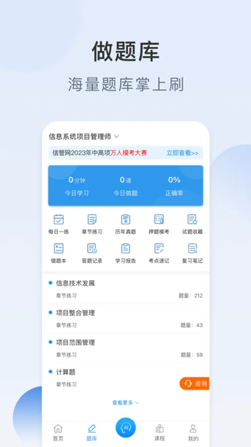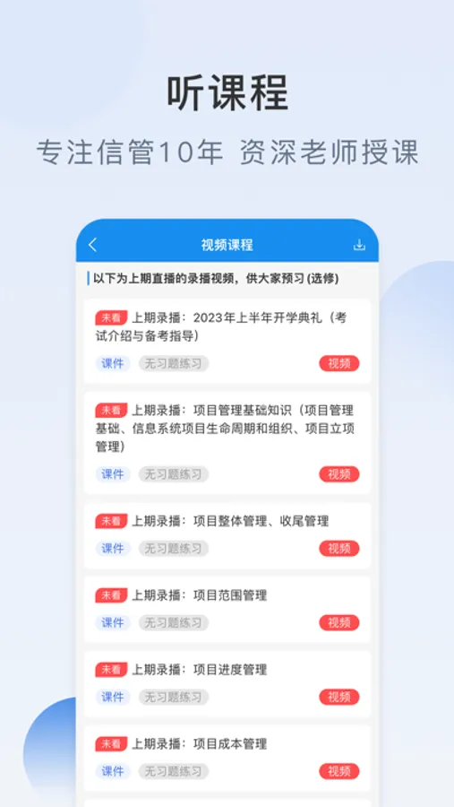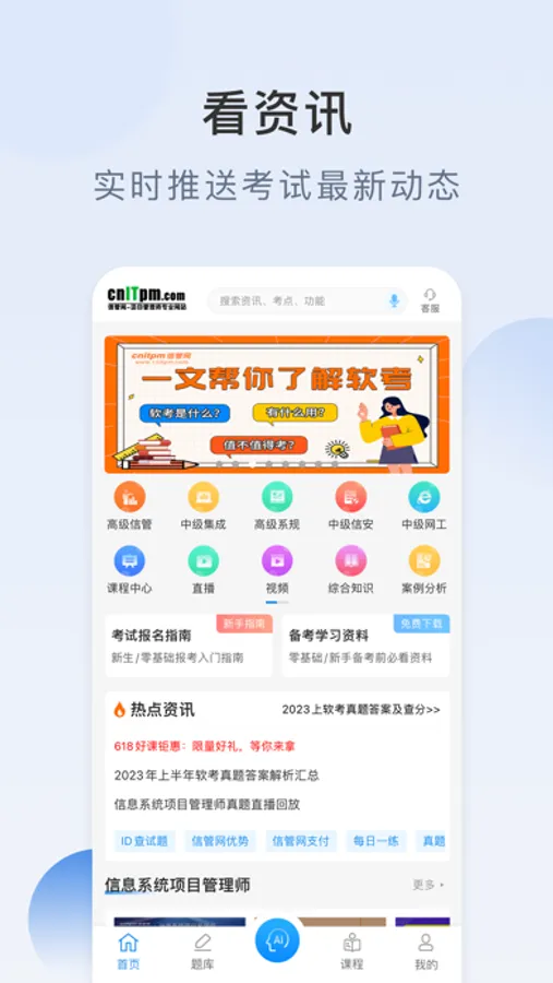 目前信管网APP提供了信息系统项目管理师、系统集成项目管理工程师、系统规划与管理师、信息安全工程师等考试科目。提供了包括考试资讯、报考指南、考试报名、考试培训、每日一练、在线答题、历年真题、视频课程等服务。