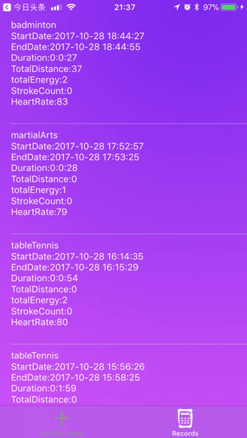 Workouts read datas from health store ,such as distance, store count, heart rate ,energy burned.also write workouts and heart rate from health store.