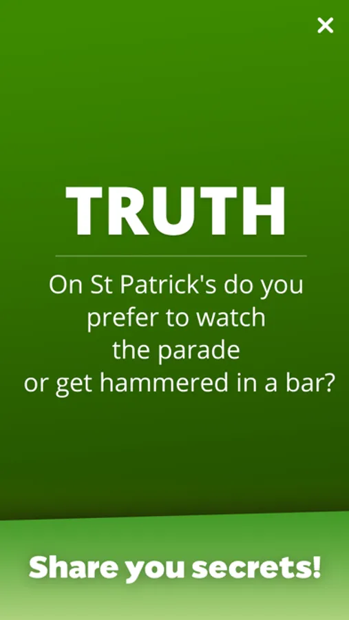 Celebrate Saint Patrick's Day 2017 like never before with a fun new update containing St Paddy's question and actions! Play with your buds in a bar, at home, on vacay - Truth or Dare is with you everywhere!