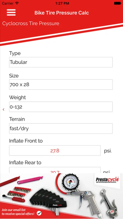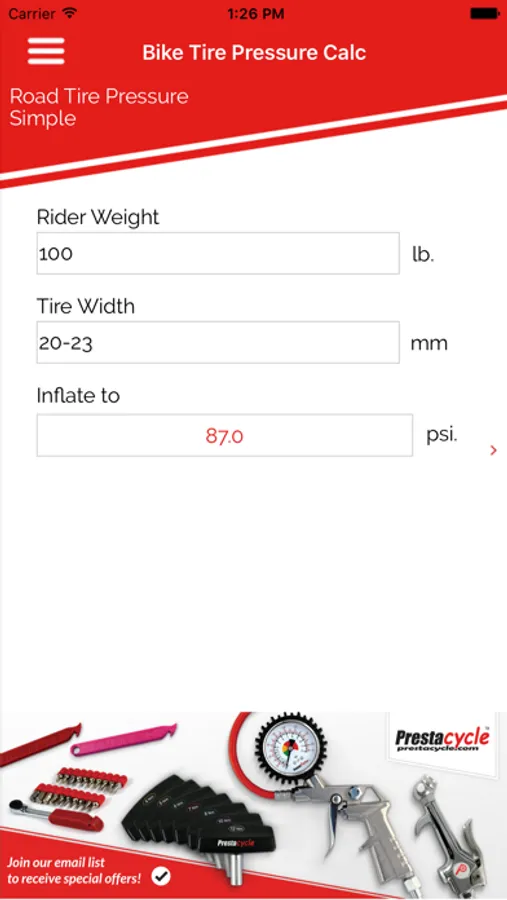 Prestacycle Bicycle Tire Pressure Calculator Screenshots