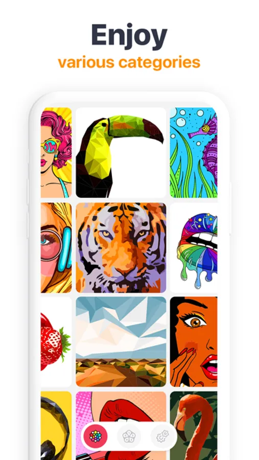 - Enjoy custom tailored galleries of unique images: choose from a variety of Mandalas, Animals, Flowers, Birds, Food, People, Sea World, Cities and other galleries.