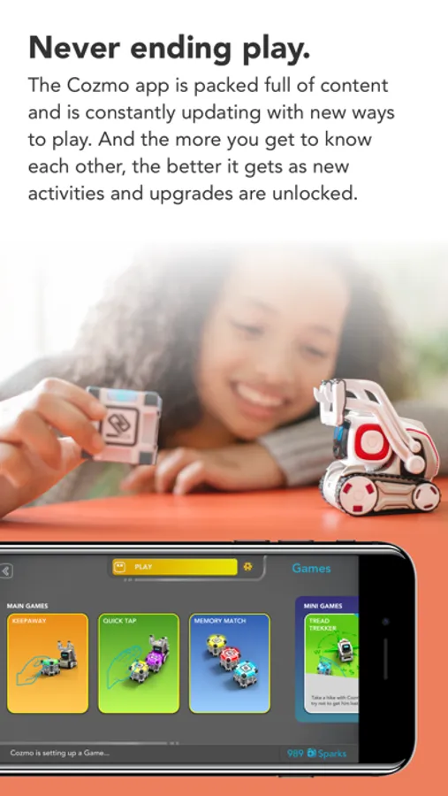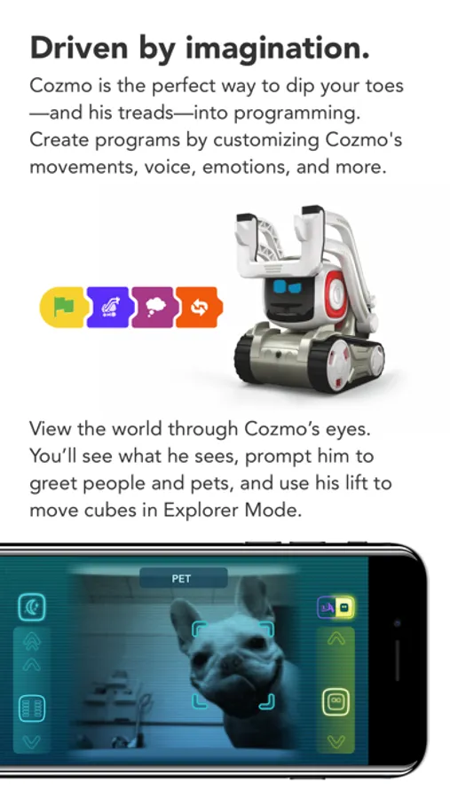 You see, Cozmo is a real-life robot like you've only seen in movies, with a one-of-a-kind personality that evolves the more you hang out. He'll nudge you to play and keep you constantly surprised. More than a companion, Cozmo’s a collaborator. He’s your accomplice in a crazy amount of fun.