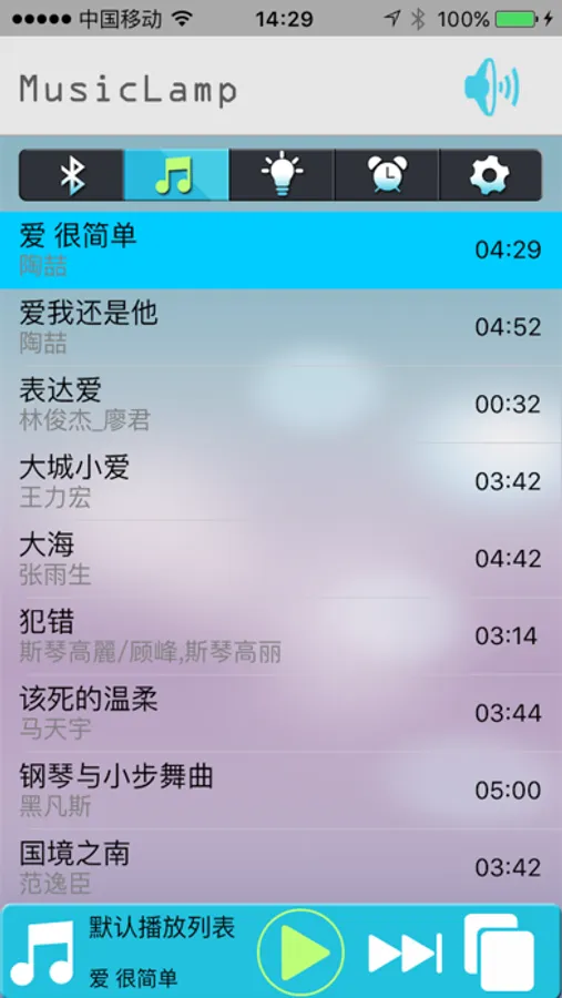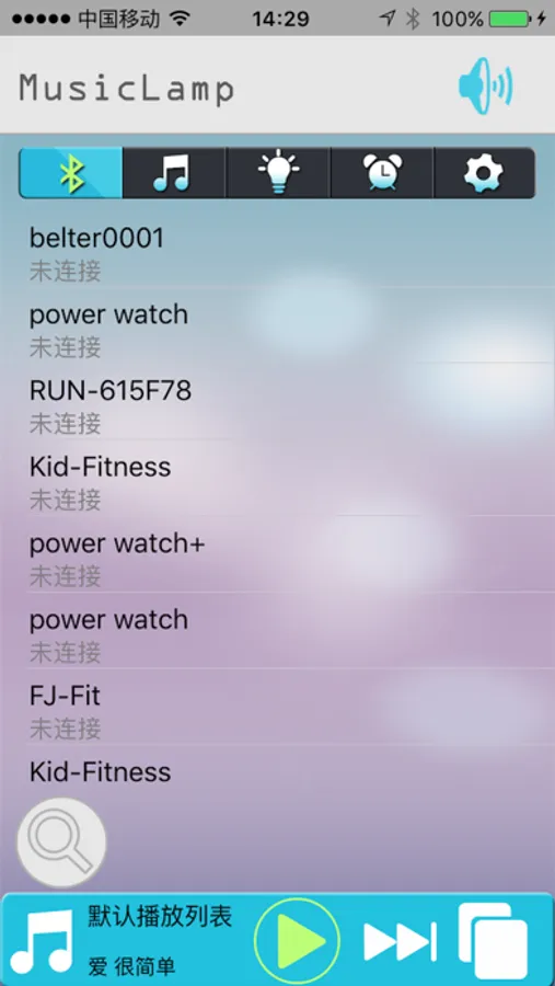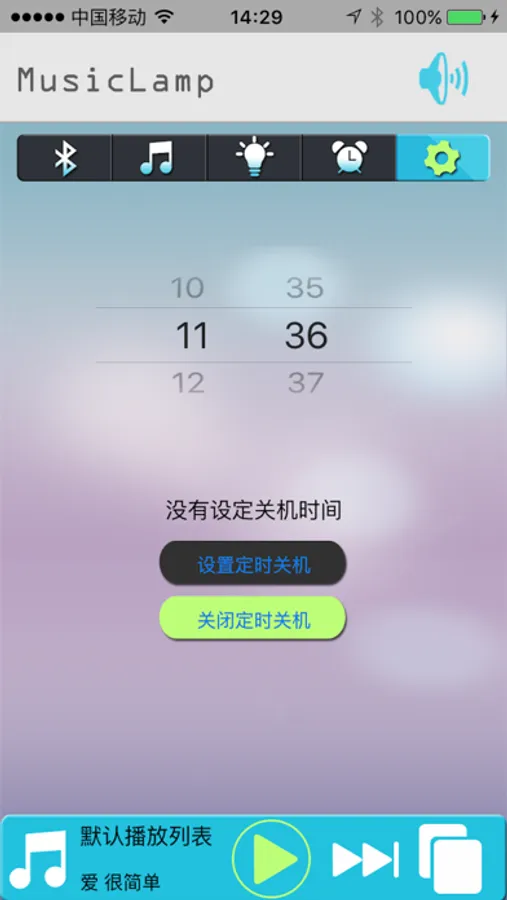 MusicLamp智能音乐控制设备,进行音乐推送,播放,控制灯光颜色及灯光模式,亮度,设定闹钟及定时关机。