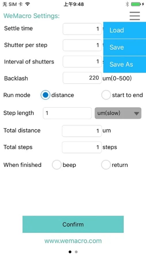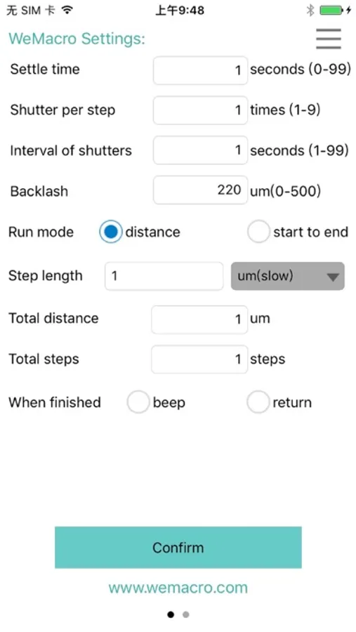 Use this app to control WeMacro focus stacking rail by Bluetooth communication. Provide 2 working mode:1 distance mode and 2 from start to end mode. The app can save or load configuration as MPE65.wm,file name end with wm .