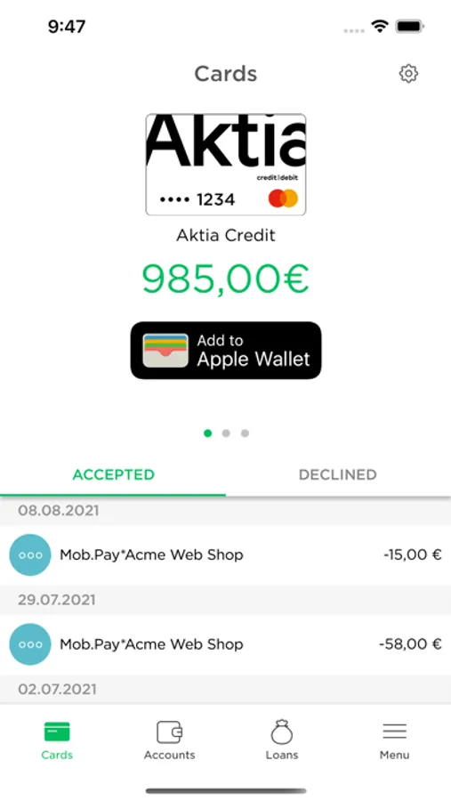 Aktia Wallet is The digital wallet that removes friction from payments and enables you to take control of your finances, the way it should work. Download the Aktia Wallet app, get a Mastercard, activate Apple Pay and experience easier payments!