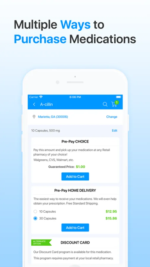 RETAIL PICK-UP. Members buy prescription medications via the app or website and pick them up at any