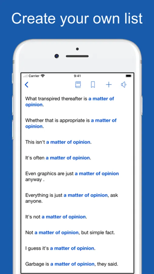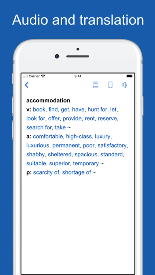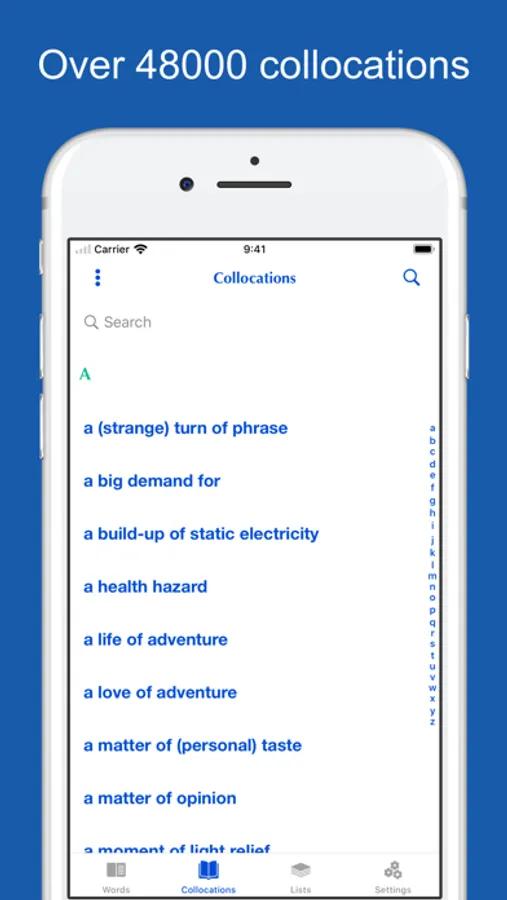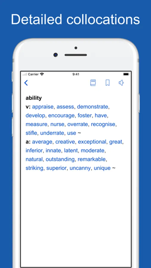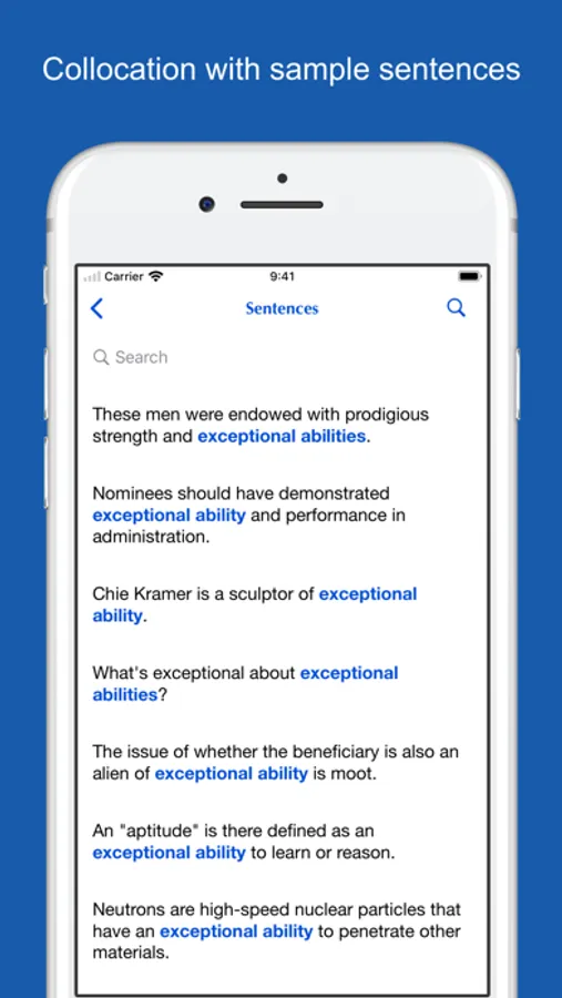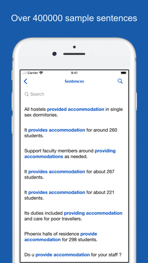 This app provides English collocations with sample sentences. Each collocations come with a number of sample sentences. It will help you how to use a collocation in actual context.