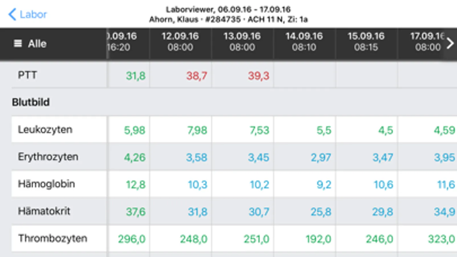 Die Sortierung neuer Befunde und Dokumente erfolgt chronologisch, ungelesene Dokumente sind dabei durch entsprechende Markierung auf den ersten Blick zu erkennen. Durch einfaches Scrollen mit dem Finger auf dem Touchpad gelangen Sie auch durch längere Dokumentlisten und können ältere Befunde sichten und vergleichen. Aufgaben zur weiteren Behandlung werden einfach in die Krankenakte eingegeben.