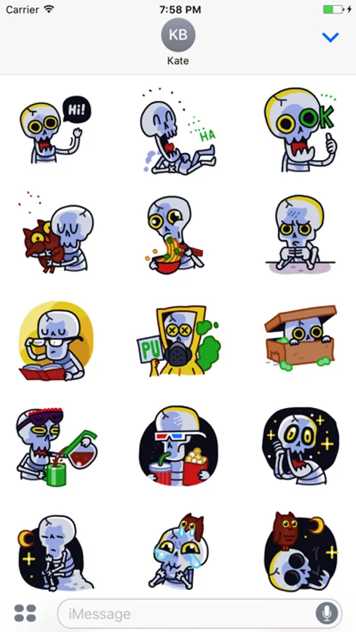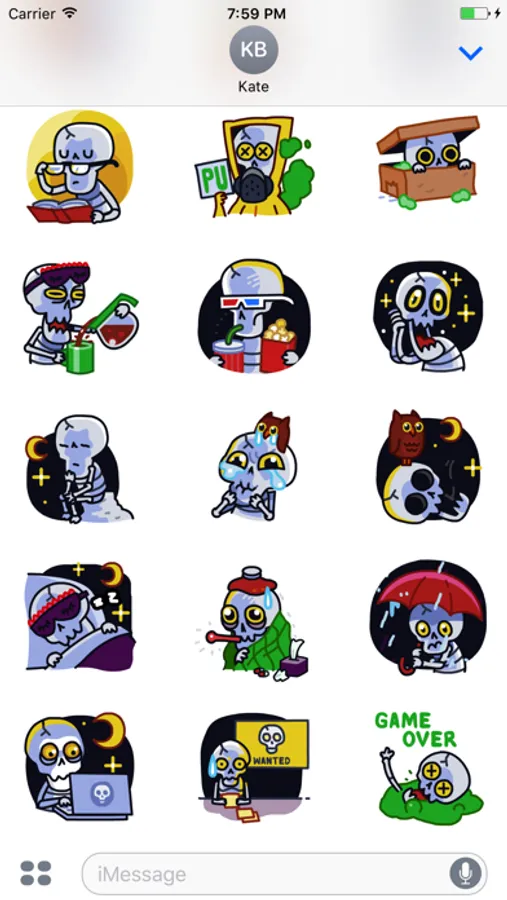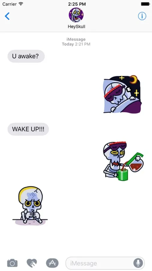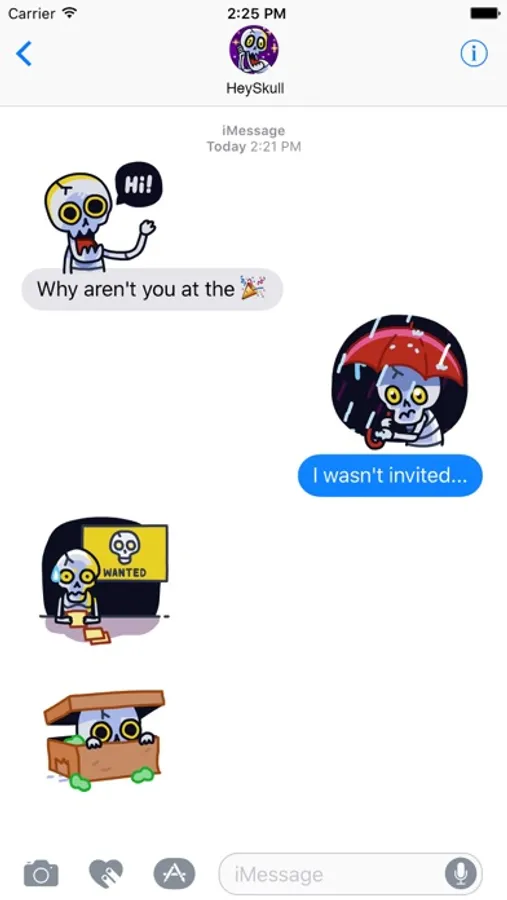 FULLY ANIMATED! Check out the Video preview in the App Store! As the day slides by and the shadows creep in, dig up these stickers and let your chat begin. HeySkull and his buddy BarnOwl help you show off your emotions with these spooky yet adorable animated stickers.