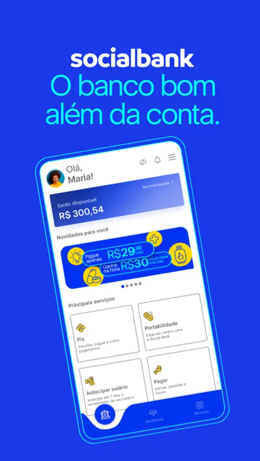 Social Bank, o banco bom além da conta. Aqui você tem acesso a serviços financeiros como pix, pagamento de boletos, antecipação de salário, opções para fazer seu dinheiro render e ainda recebe vários benefícios para te ajudar a economizar muito dinheiro todo mês em bônus internet celular, conta de luz, gás, medicamentos, consultas e até mesmo auxílios que deixam você e sua família protegidos.