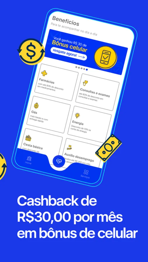 • Ganhe todo mês cashback de R$30 em bônus celular;