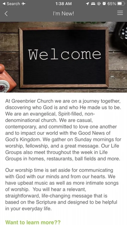 Greenbrier Church is an evangelical, Spirit-filled, non-denominational church. We are casual, contemporary, and committed to love one another and to impact our world with the Good News of God’s Kingdom. Our app allows you to watch live sermons, download message notes, provides daily devotionals, and allows you to keep up with everything going on at Greenbrier Church.