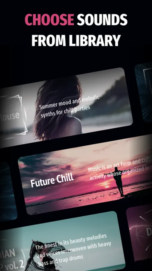 • Big library of sample packs (Trap,Hip-Hop,Deep House,Techno and more) with pro quality.It made by different sound producers specifically for our application
